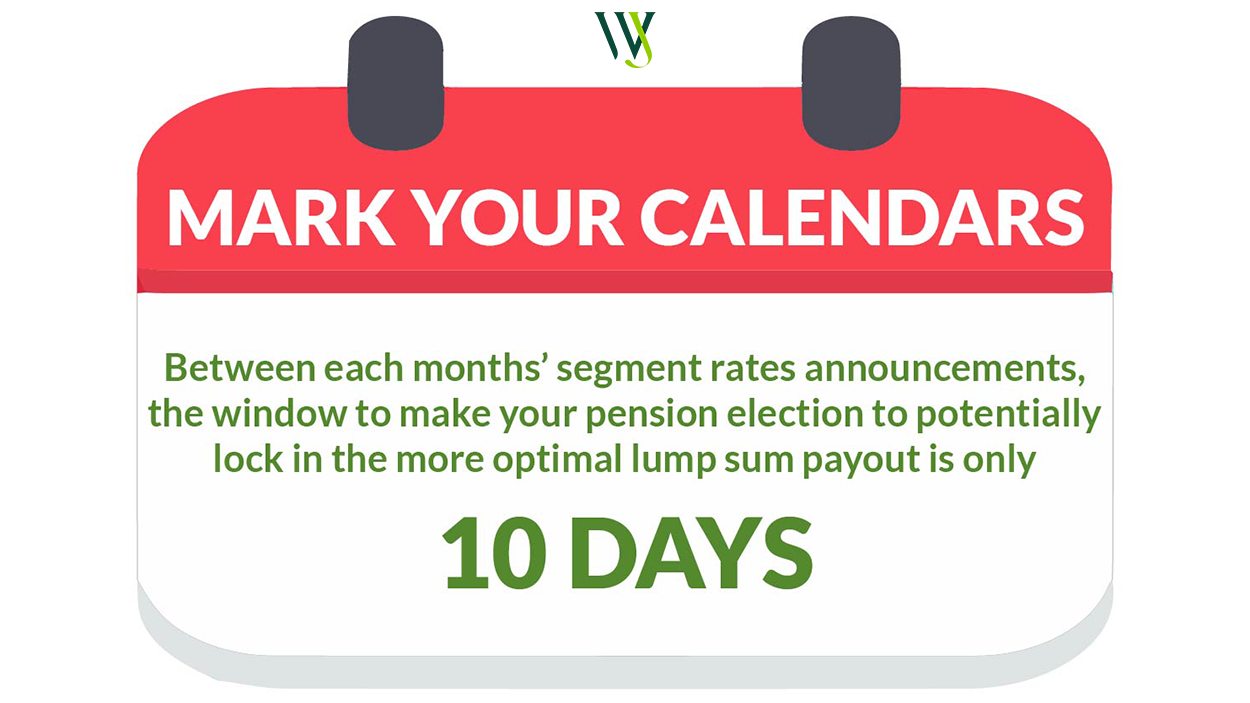 There can be a bit of a timing strategy around electing your distribution. You must make your pension distribution election 30 days before the distribution date in most circumstances. If you plan to elect a distribution effective January 1, for example, you must submit your election by December 1. As mentioned before, your January lump sum distribution would be based on September interest rates. What if you wanted to see if applicable interest rates drop in October, rendering a more significant lump sum amount for a February distribution? You will not have this data until the segment rates get published around November 20. If the rates in October rose, rendering a smaller lump sum for February, you would have ten days to lock in your September rate for a January distribution.