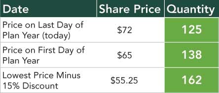 Had this employee simply purchased $9,000 of company stock on the last day of the plan year they would only receive 125 shares. By participating in the ESPP however, this employee ends the year with 162 shares of company stock. This equates to a total discount of more than 30% per share!