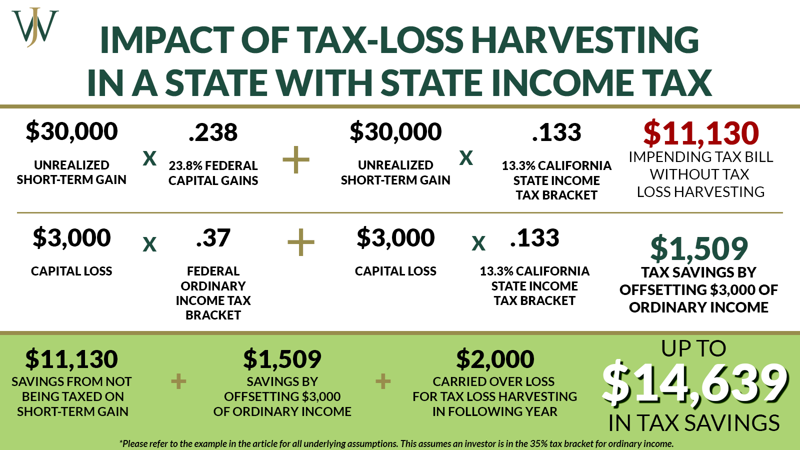 - The tax savings for this taxpayer by getting to offset ordinary income by up to $3,000. If we assume the taxpayer is in the highest ordinary income brackets at both a federal level and for California’s income tax, it will look something like this: