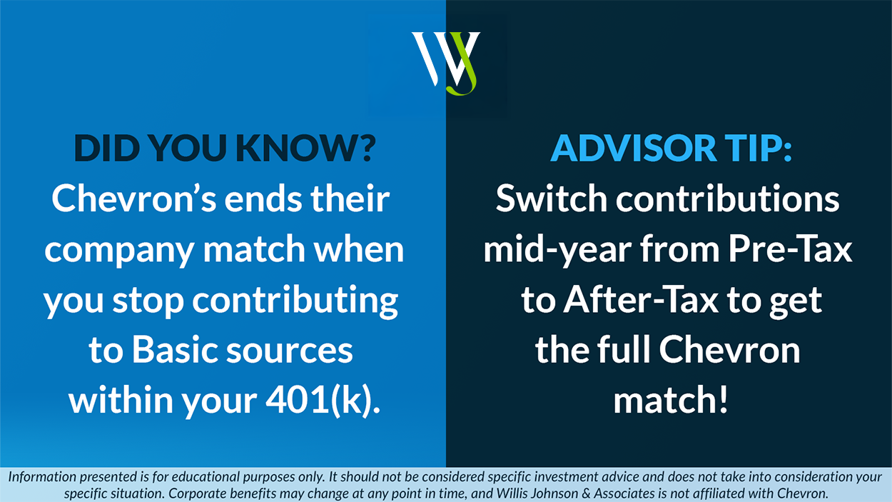 Chevron makes a company match to the ESIP if an employee is making Basic contributions. Chevron will make a 4% matching contribution for every 1% an employee contributes to Basic. Suppose you max out your Pre-Tax employee contributions halfway through the year. In that case, you will switch to the After-Tax source within the 401(k) to make Basic contributions to continue receiving company contributions.
