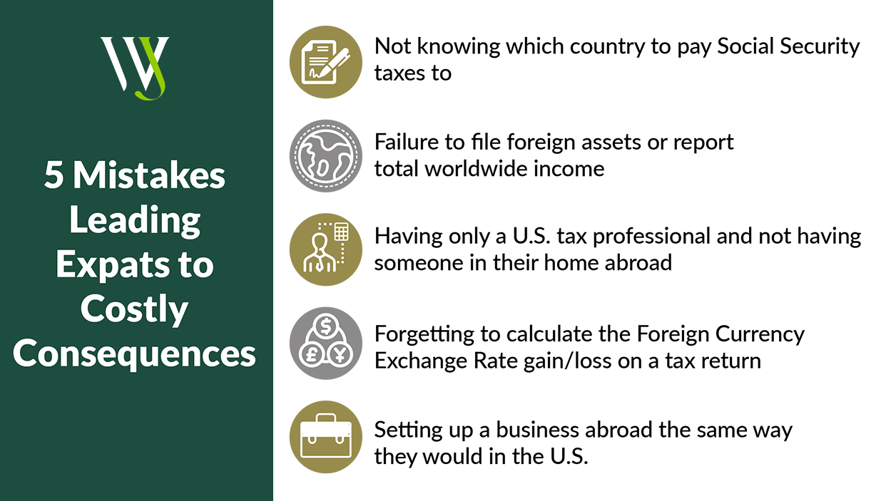 Depending on how your business is legally defined, you will be required to file a reporting form with your U.S. tax return every year. For example, if the legal entity through which you are operating your business is classified with legal liability, you will be required to file a Form 5471. If the entity qualifies as a partnership, you will be required to file a Form 8865. There are additional steps you can take to simplify by becoming a disregarded entity, which would require you to file a Form 8858. There are stiff penalties for failing to file these forms, so educate yourself and consult with our team of professional advisors at WJA, who can assist you with these determinations.