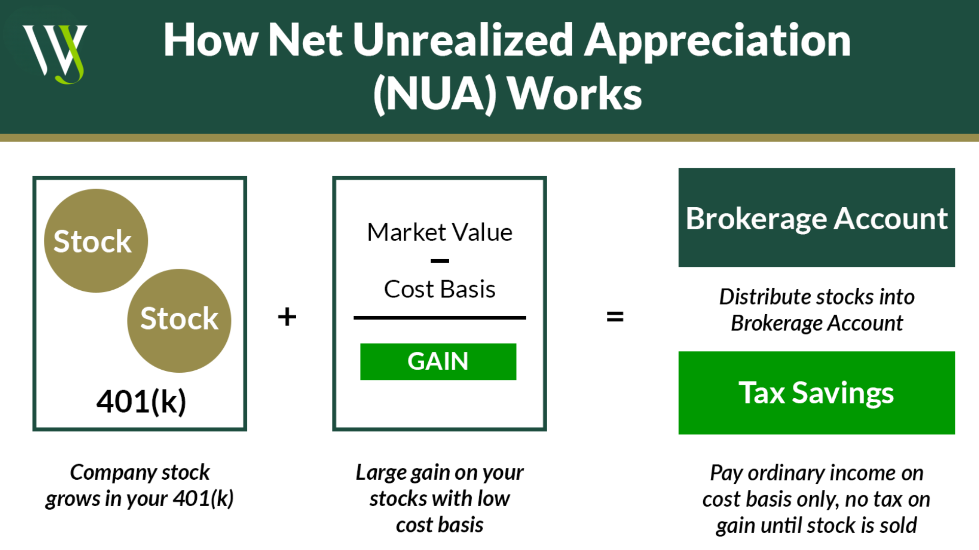 Net Unrealized Appreciation is the difference in value between what you or your employer paid for the stock (cost basis) and the current market value of your company stock held in your 401(k). If you have NUA, you can distribute the stock from your 401(k) to a brokerage account, instead of rolling it over to an IRA (which would result in having to pay ordinary income taxes on the entire distribution).